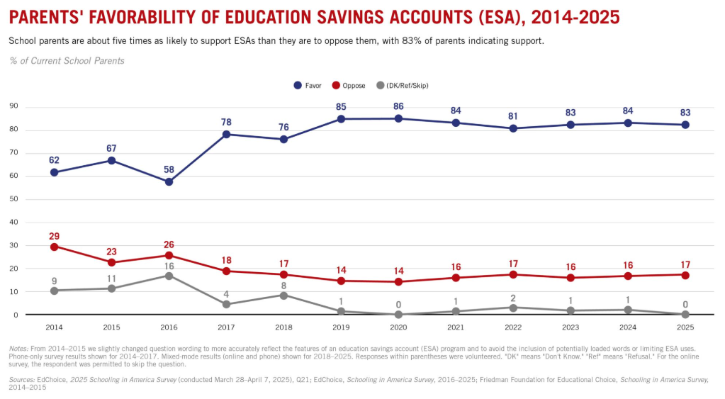 A recent 2025 EdChoice survey, which assessed the opinions of a nationally representative sample of parents, found that over four out of five parents (or 83 percent) favored educational savings accounts. The favorability percentage has hovered in the mid-80s since 2019, when many parents gained a high appreciation for school flexibility due to pandemic-era constraints.