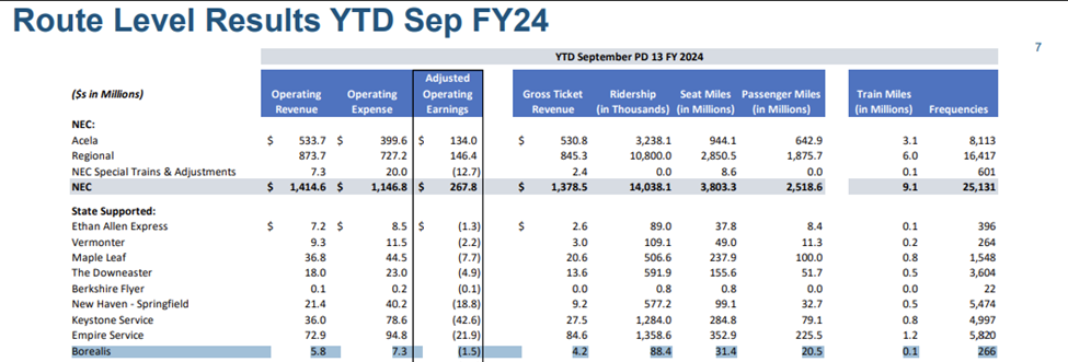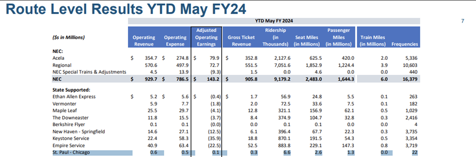 Looking at the actual numbers, the story is even grimmer. By September 2024, when Amtrak closed its books for the year, the total loss (Gross Ticket Revenue minus Operating Expense) totaled $3.1 million and the state subsidies (Operating Revenue minus Gross Ticket Revenue) totaled $1.6 million, or $18.10 per ride.