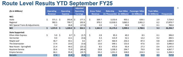 These numbers have deteriorated further over the subsequent year. Amtrak’s numbers are now out for the year up to September 2025. They show that the total loss (Gross Ticket Revenue minus Operating Expense) totaled $10.8 million and the state subsidies (Operating Revenue minus Gross Ticket Revenue) totaled $6.4 million or $30.06 per ride. This is 66% up from the previous year.