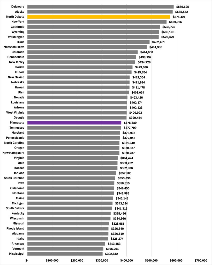 For now, Figure 1 shows the 50 states ranked by their per worker stocks of physical capital for 2024. Delaware — where the per worker stock of physical capital grew by 3.9% from 2023 to 2024 — has replaced North Dakota — where it shrank by 0.8% — as the top ranked state. Minnesota maintained its ranking of 24th out of the 50 states and Mississippi slipped one place to bottom: There is scope fo the Magnolia State to boost economic growth even further if it can boost physical capital growth.
