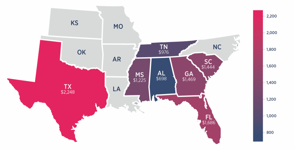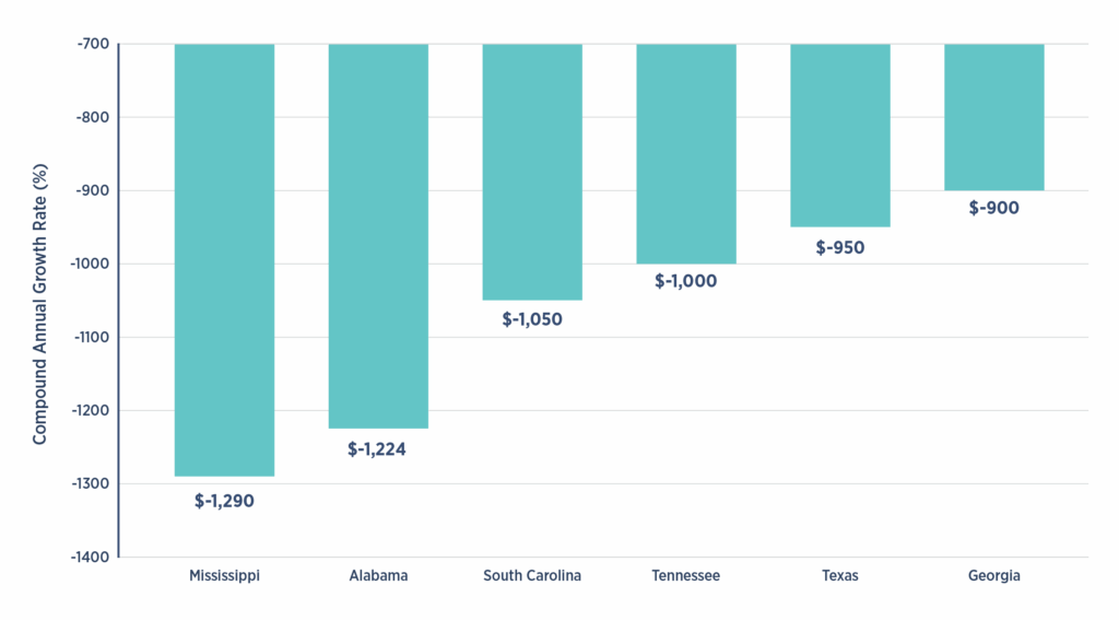 Renters, who comprise more than a third of Florida households, face indirect but significant financial burdens. Landlords in commercially zoned, highly dense municipalities typically pass through 50% to 85% of their property tax bills in the form of higher rent, as found by the Federal Reserve Bank of Philadelphia. In high-cost metro areas like Miami-Dade, Orlando, and Tampa, property taxes can account for 20% or more of the monthly rent. This compounds Florida’s housing affordability crisis, where the median gross rent now exceeds $1,800, and more than half of renters spend over 30% of their income on housing. According to state-level data from Zillow’s Observed Rent Index, Florida’s average monthly rent for a 2-bedroom apartment was $2,500 in 2024. Figure IV below shows that relative to six other states in the same region as Florida, the Sunshine State has the highest average annual rent for all rental homes.