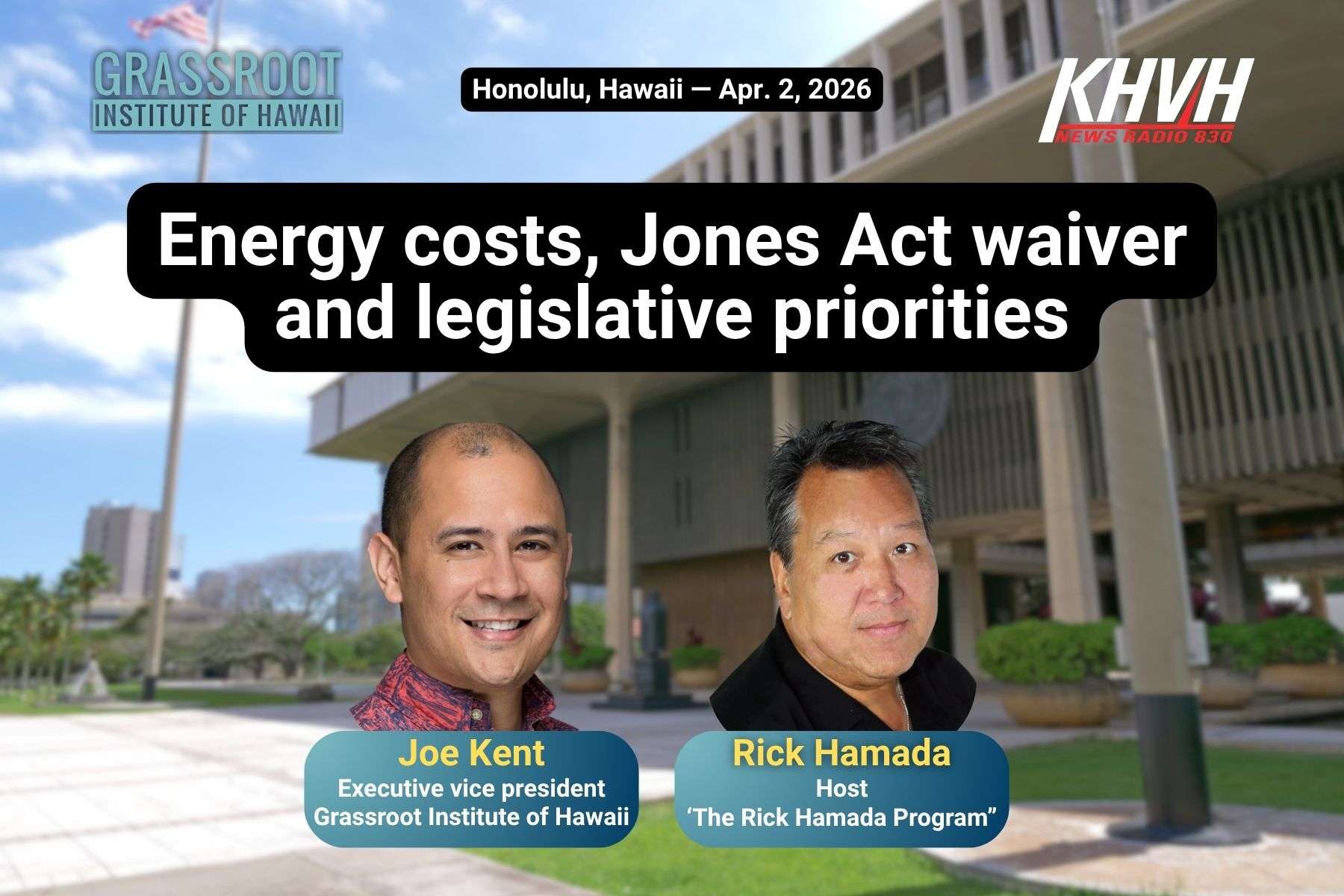 Joe Kent, executive vice president of the Grassroot Institute of Hawaii, had a wide-ranging conversation with KHVH radio host Rick Hamada on April 2 that touched on fuel prices and energy policy, the recent Jones Act waiver, some of Grassroot’s legislative priorities this session, cutting the state budget, the government’s role in economic recovery and more.