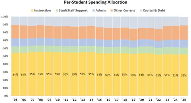 Despite this guidance, school districts barely allocate half of their spending to Instruction. In fact, school funding more than doubled since 2005, yet districts reduced Instruction spending from 54% to 52%.