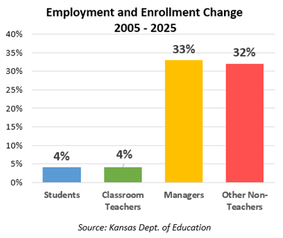 Over the last 20 years, enrollment and classroom teacher employment have both increased by about 4%, but employment of managers and other non-teaching employees jumped by 33% and 32%, respectively.