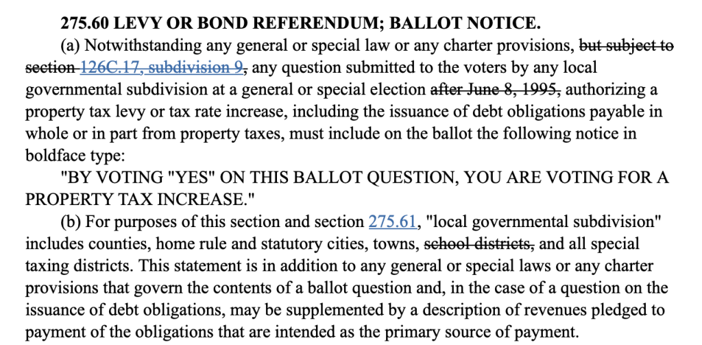 A bill that would remove the longstanding requirement for school district referendums to include clear ballot language informing voters that a “yes” vote authorizes a property tax increase is being considered in the Minnesota Senate.