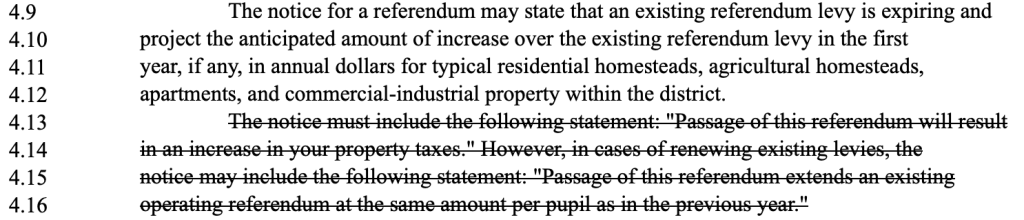 S.F. 1310, introduced by Sen. Steve Cwodzinski (DFL-Eden Prairie), eliminates wording that currently notifies taxpayers how their property taxes would change if a school district referendum is approved.