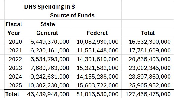 In reference to DHS spending, we used the word “budget” above. In the world of DHS, there is no “budget” as we would understand the term. For the most part, DHS administers “entitlement” programs, where recipients or vendors get the money, if they qualify, regardless of whether any “budget” (estimate) is exceeded. If DHS blows by the budget, they just pay out the money and count on the state treasury figuring out the implications later.