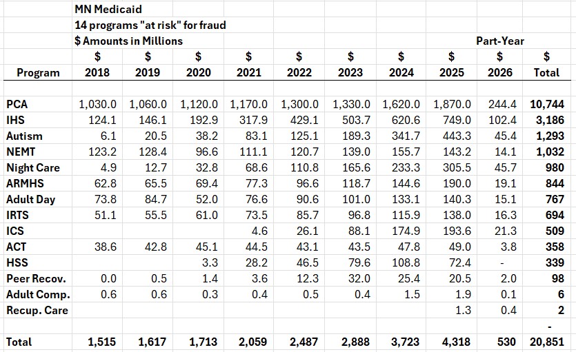 Lou Raguse of KARE-11 has performed a public service by assembling in one report the spending by the state of Minnesota on 14 “at risk’ Medicaid programs. You can read his report here. Total spending on these 14 programs since 2018 is approaching $21 billion (with a “b”).