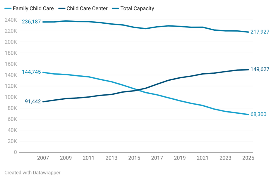 Since 2007, Minnesota has lost over half of its family childcare capacity. In 2025, family childcare accounted for less than one-third of total capacity in the state. This is down from over 60 percent in 2007.