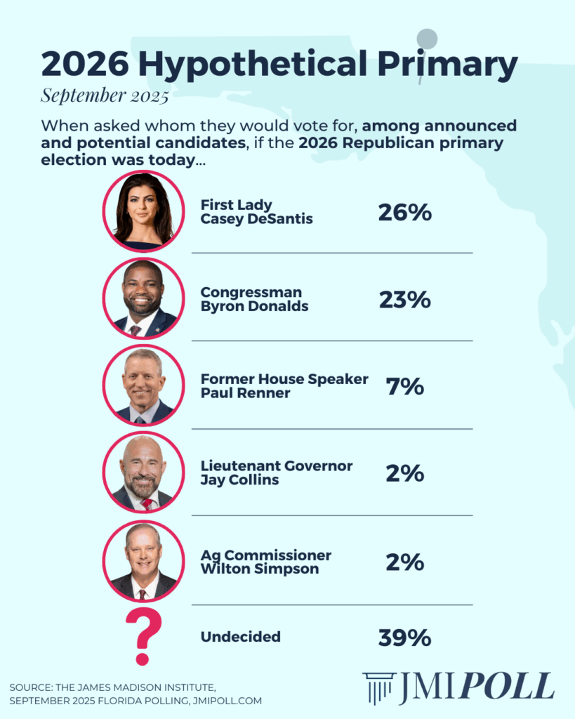 In an expanded field, First Lady Casey DeSantis tops at 26%, followed by Donalds at 23%, Renner at 7%, Florida Lieutenant Governor Jay Collins at 2%, Florida Agriculture Commissioner Wilton Simpson at 2%, and 39% remain undecided.