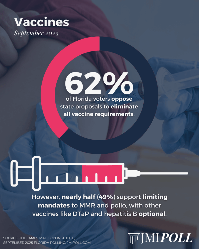 Florida voters favor maintaining robust vaccine policies for public schools, with 62% opposing a state proposal to eliminate all vaccine requirements —such as for measles, polio, and chickenpox. Just 29% support the change.