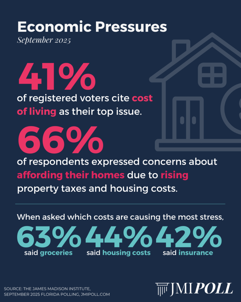 Cost-of-living concerns continue to dominate the minds of Florida voters, with 41% citing it as their top issue, and a majority are stressed by everyday expenses. A striking 66% express concern about affording their homes due to rising property taxes and housing costs.