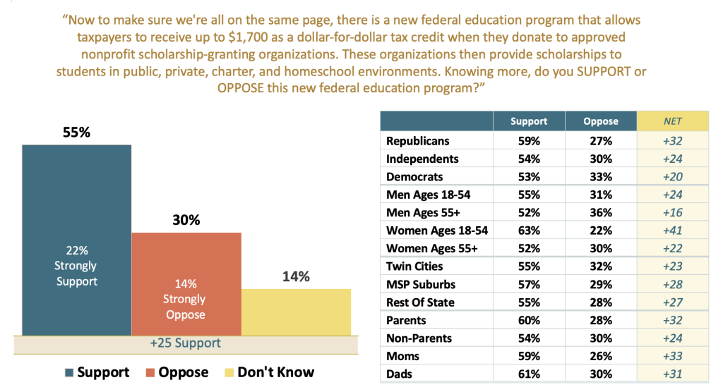 Polling shows that a majority of Minnesotans across the political spectrum support the state’s participation in the federal tax-credit program. Support is above 50 percent for every demographic group, reflecting broad recognition that the program helps families afford helpful educational services.