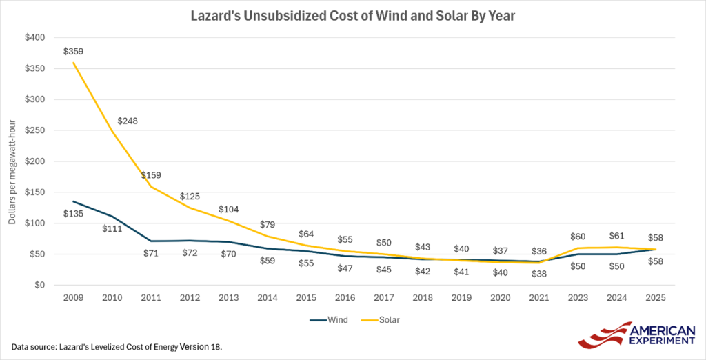 Mitch Rolling, former American Experiment policy fellow, demonstrated in 2023 the unsubsidized cost of electricity from wind and solar in Minnesota from 2012 to 2023. Minnesota’s newest wind facilities now cost about $62.91 per MWh, up from $39.12 per MWh in 2019, or a 61 percent increase. New solar installations were even higher at $103.83/MWh in 2023, up 47 percent from $70.46/MWh in 2020.