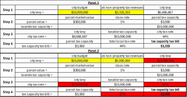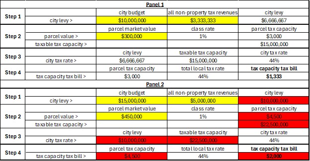 Look what happens, by contrast, when we increase the “city budget” between Panels 1 and 2 in Table 2 (assuming that one third of revenues are non-property tax in both scenarios). The “city levy” goes up, highlighted in red, but the tax base remains the same so the “city tax rate” goes up in Step 3. And this higher rate applied to the same “parcel tax capacity” in Step 4 gives us a higher property tax payment of $2,000.