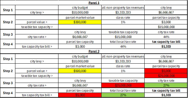 Panel 2 shows the property tax payment for exactly the same city except that each property is now worth $500,000. Because the average property is worth more the “parcel tax capacity” and “taxable tax capacity” — the city’s total tax base — are higher than in Panel 1, highlighted in red. But the “city levy” is the same so, spread over a larger tax base in Step 3, it gives a lower “city tax rate” than Panel 1, highlighted in green. And, because of this lower tax rate, even with the high “parcel tax capacity,” Step 4 gives us the exact same property tax payment as in Panel 1; $1,333.