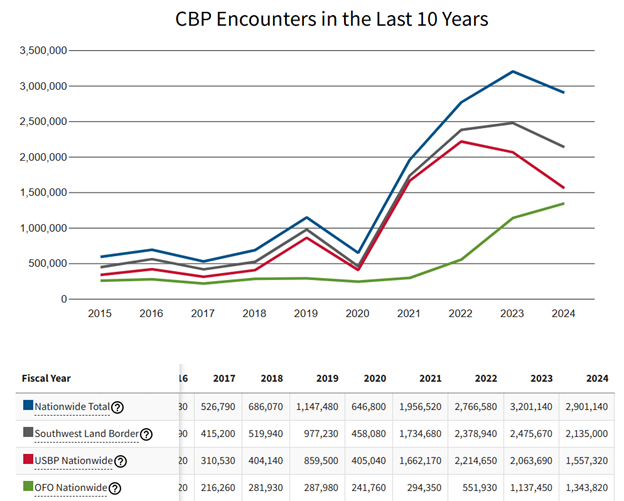 The “open border” policies of the Biden administration led to an unprecedented surge at our borders. During the four years under Biden (FY’s 2021-2024), Customs and Border Patrol (CBP) encountered 10,825,387 people attempting to cross our borders – a four-year average of 2,706,346/year.