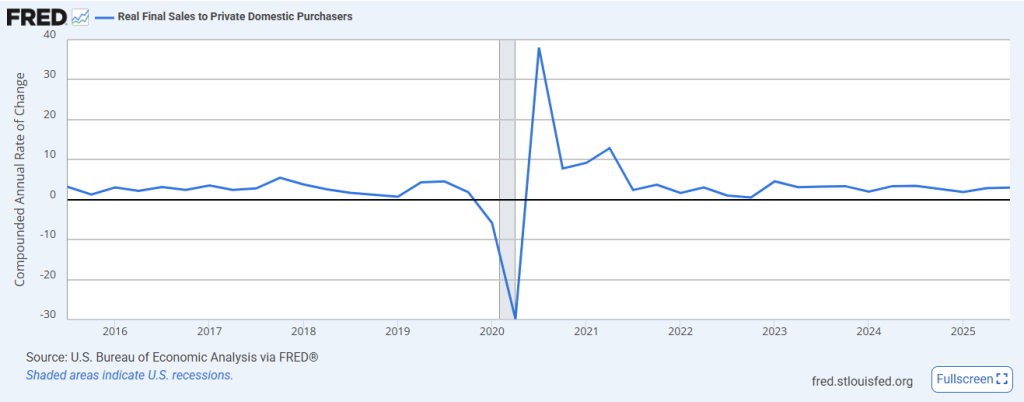I have referred previously to “Real final sales to private domestic purchasers,” a sort of “core” GDP. The BEA reports that this: “increased 3.0 percent in the third quarter, compared with an increase of 2.9 percent in the second quarter.” Indeed, it compares with an average of 2.8 percent from Q3 2015 to Q4 2019 and 2.7 percent from Q3 2021 to Q2 2025, as Figure 1 shows.