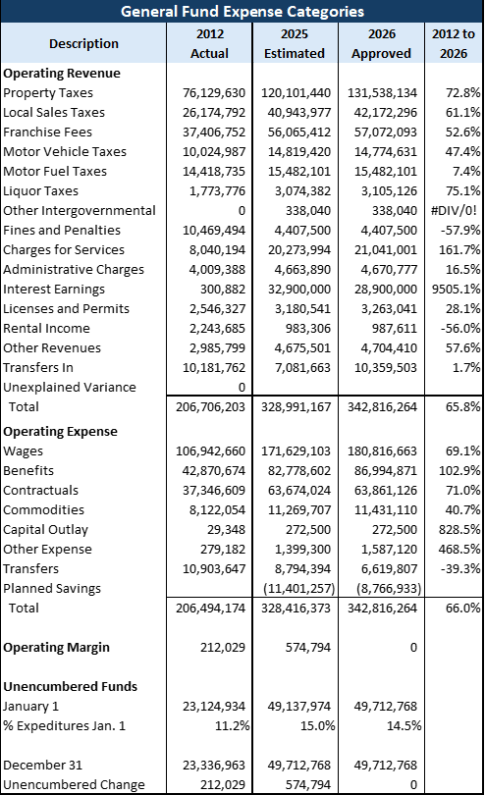 A taxpayer-focused budget process prevents spending and tax increases from getting out of control, and, having just hired a new city manager, this is a great time to examine spending. The adjacent table shows budgeted General Fund spending for 2026 is 66% higher than in 2012, while inflation was 40%. Spending would be about $54 million less if it had increased for inflation, and that’s just the General Fund.